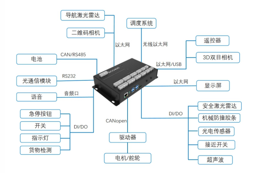 功能:1)导航:自主导航行驶功能,兼容SLAM 导航、反射板导航、二维码导航2)运动控制:自主避障模式、巡线模式、避障巡线混合模式3)自主充电:拥有自主充电功能4)安全防护:3D 视觉立体/避障识别、激光、超声波、光电、机械防护5)通信:支持外接WIIF,4G 通信、5G通信模块6)开发:支持二次代码开发,技术论坛和技术培训